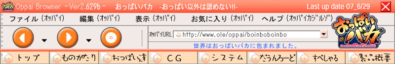 パイ拓の泉 トップへ 入り口へ トップへ あらすじ キャラクター紹介 サンプルCG システム紹介 ダウンロード 情報その他諸々 ボインボボインボ 製品概要 進む 戻る